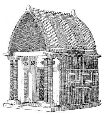 Desenho da reconstrução conjectural do primeiro templo de Hera Akraia em Peracora, perto de Corinto. Data: c. -800. Atenal, National Archaeological Museum. Desenho: Humfry Payne, 1940.